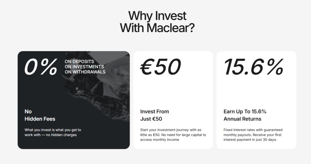 • Provision Fund: Maclear sets aside ~2% of funded project amounts into a separate fund. This is designed to cover payments if a borrower defaults. (Note: This is discretionary and not an insurance policy).
